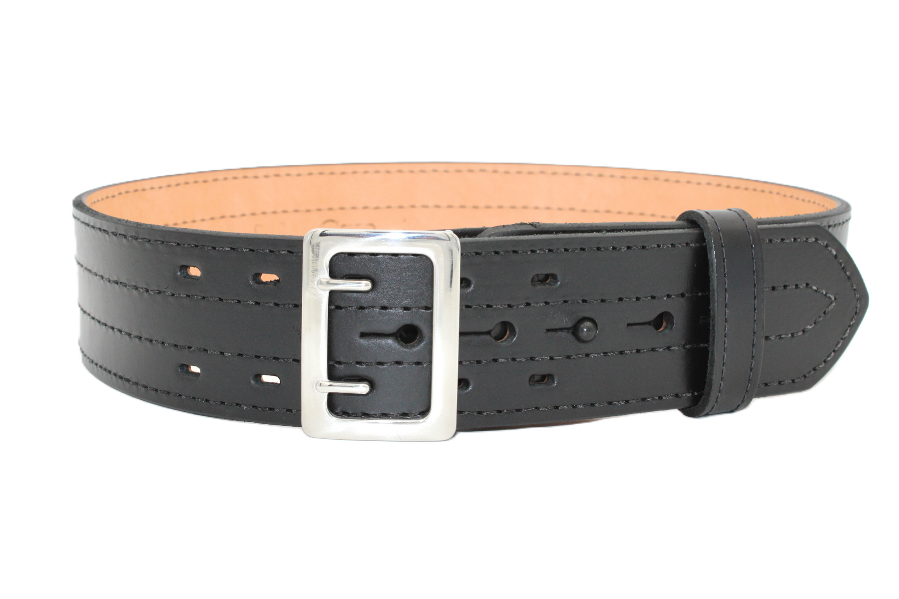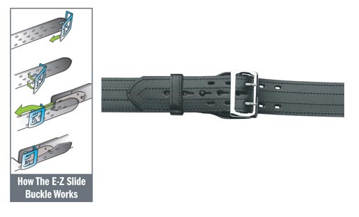 Removable E-Z Slide buckle. Fully lined. Attractive 4 row stitching. 2-1/4 in. wide. Tanned to conform to body. Nickel or brass Available in even sizes 24" to 60" Black Leather or Hi-Gloss |