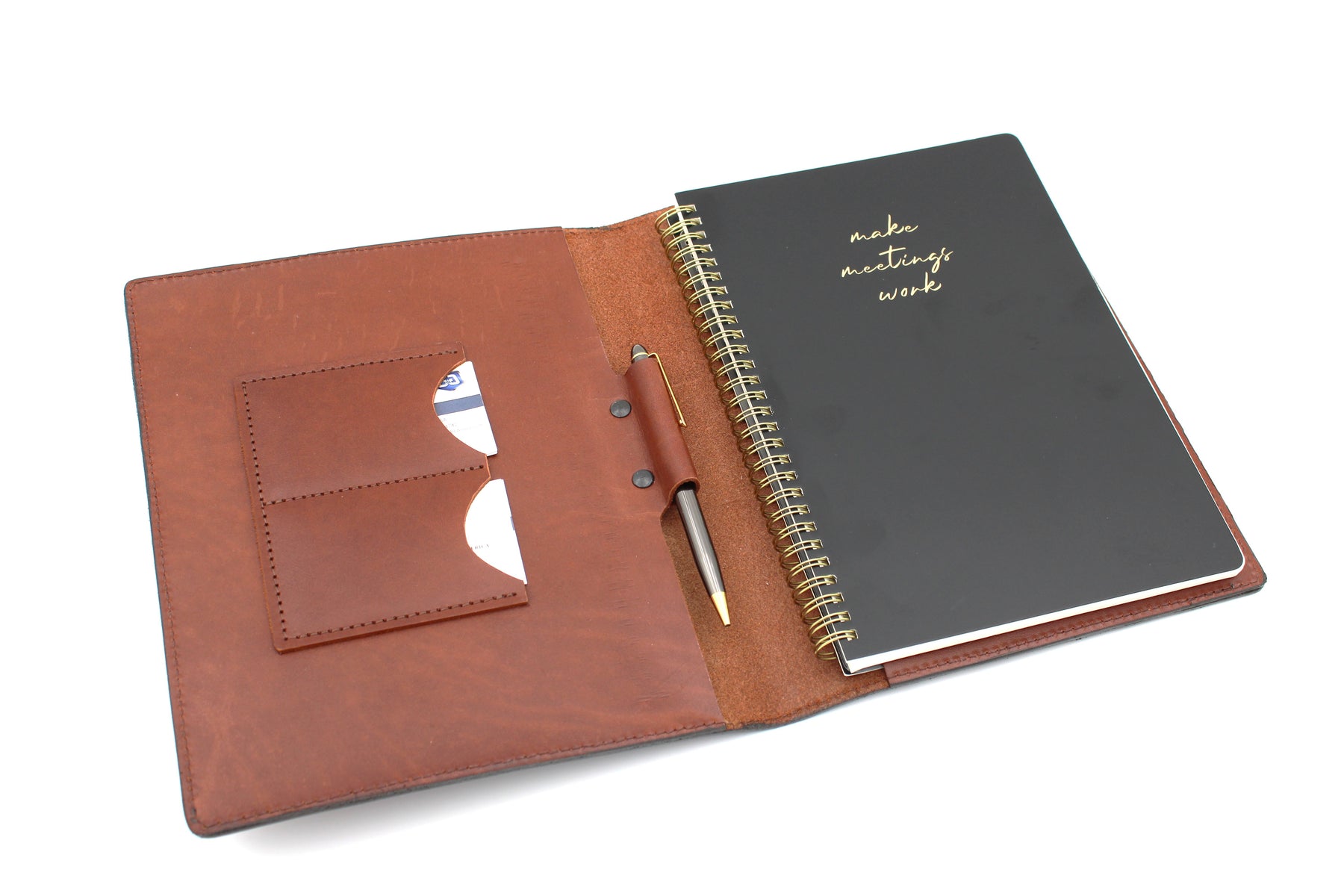 Crafted from premium full grain leather, this notebook transforms everyday note-taking into a refined professional experience. The durable cover develops a distinctive patina over time, becoming more characterful with use. Thoughtfully designed with dedicated slots for pens and business cards, it keeps your essentials organized and within reach. Whether you're capturing ideas during client calls or documenting action items, this notebook ensures you're always prepared to make meetings work. An investment in quality that serves the discerning professional.